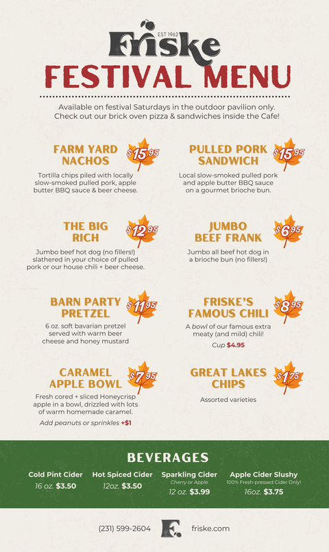 Check out the menu for our indoor Cafe- Brick oven pizzas, sandwiches, and more!